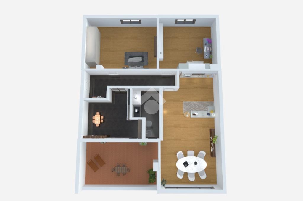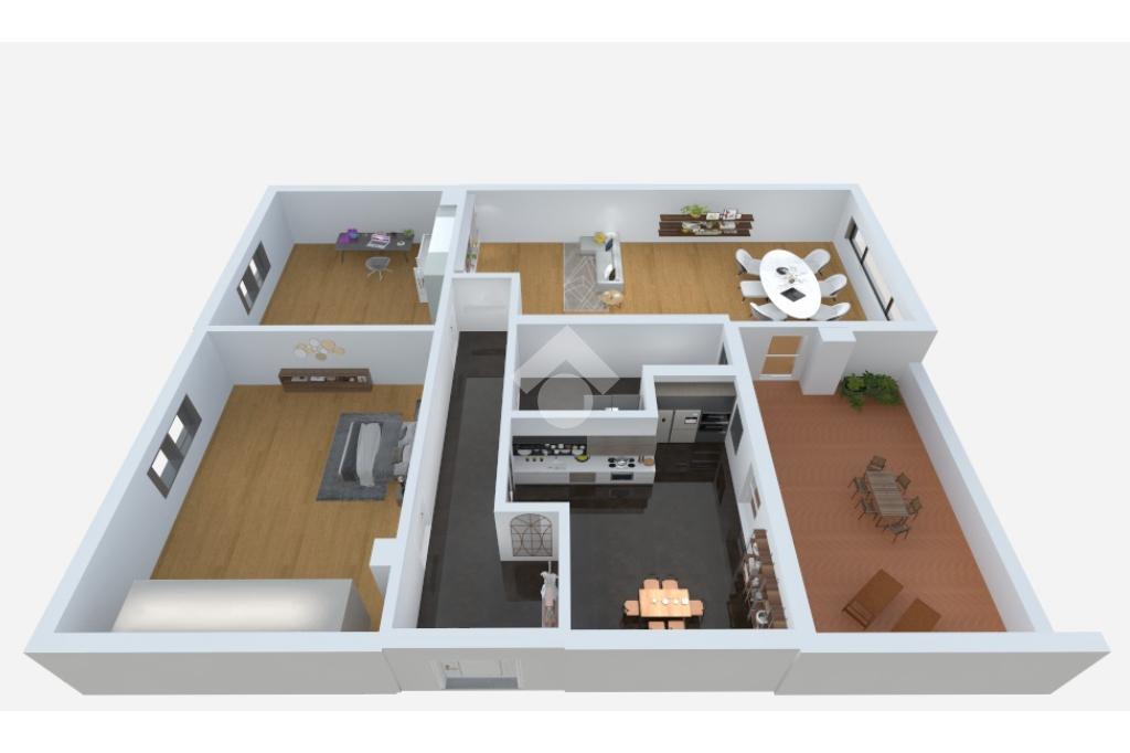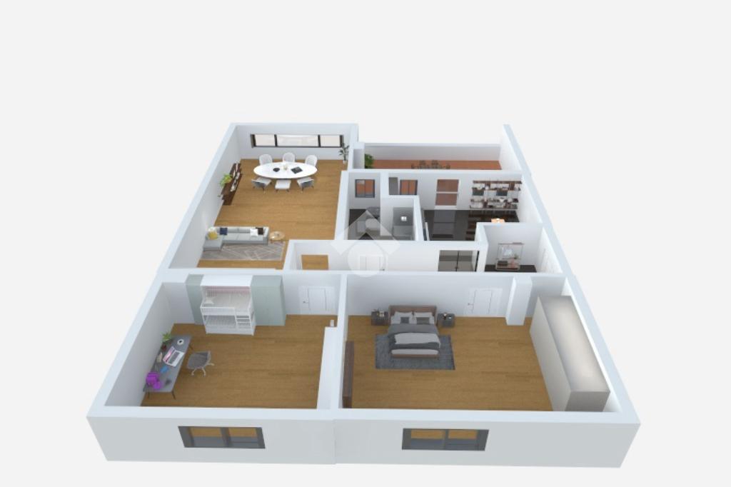 Il doppio soggiorno con parquet e la cucina, entrambi con affaccio diretto sul terrazzo, creano una zona giorno conviviale e funzionale. La zona notte è composta da due camere da letto rifinite con parquet 'Tark Viva Line' in rovere spazzolato, posato su materassino fonoassorbente, che offre comfort acustico e un tocco di eleganza. L’immobile è dotato di riscaldamento centralizzato ad uso semiautonomo con valvole e contabilizzatori, nonché di quattro climatizzatori caldo/freddo, che ne garantiscono ulteriormente il massimo comfort in ogni ambiente e in tutte le stagioni; in particolare, nella seconda camera è stato installato un climatizzatore 'Samsung Windfree', controllabile da remoto tramite smartphone. Gli infissi di tutta la casa sono dotati di doppi vetri.